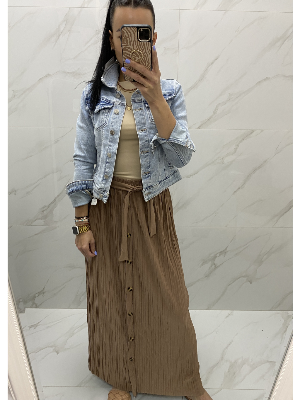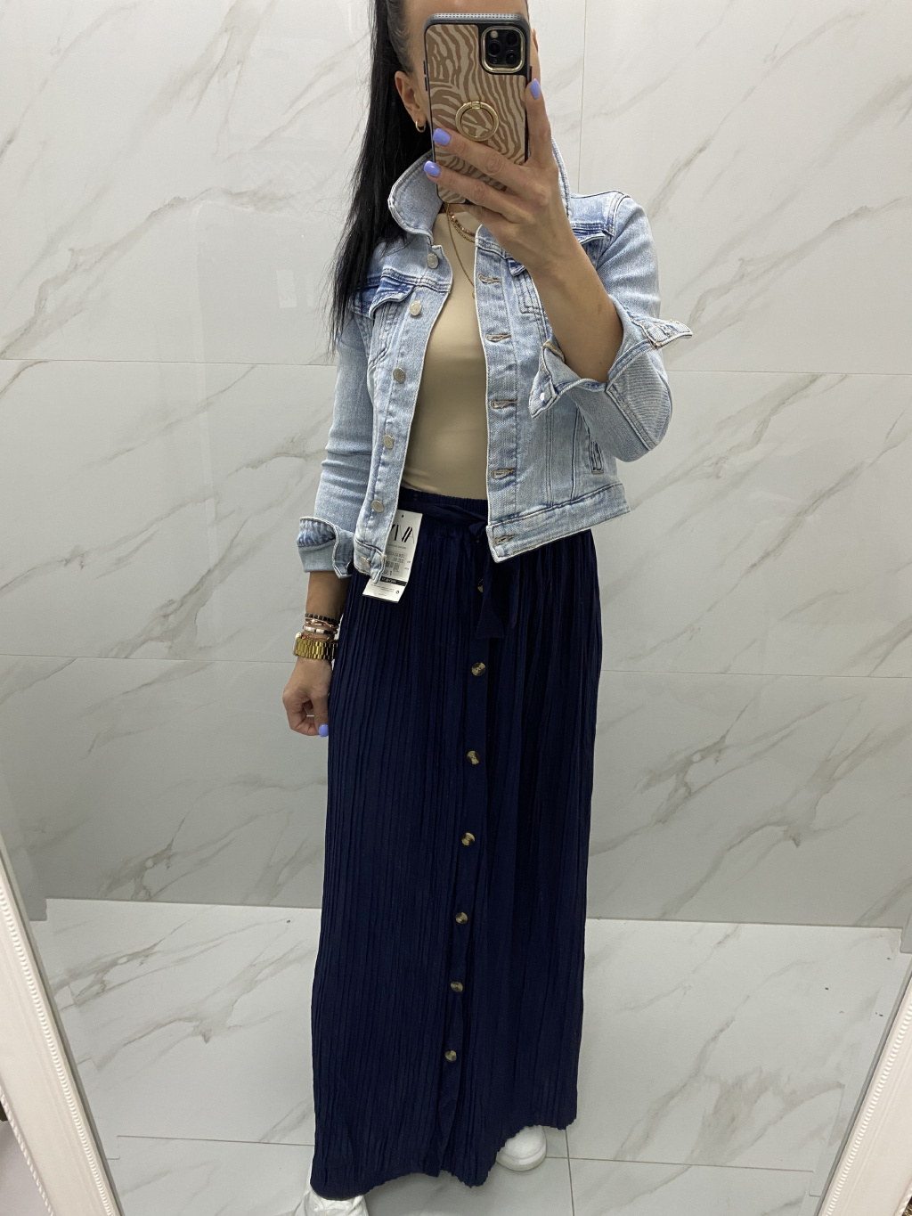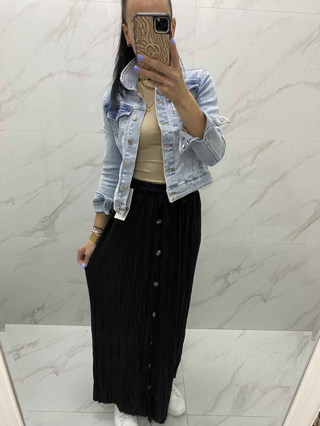 Stylové zapínání na knoflíky po celé délce a zavazování v pase dává možnost přizpůsobit si střih podle sebe. Skvěle se kombinuje s crop topem, basic trikem i džínovou bundičkou.