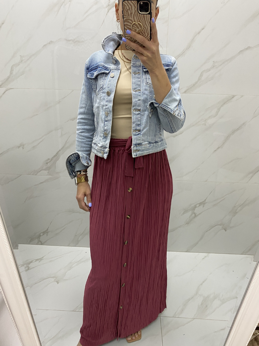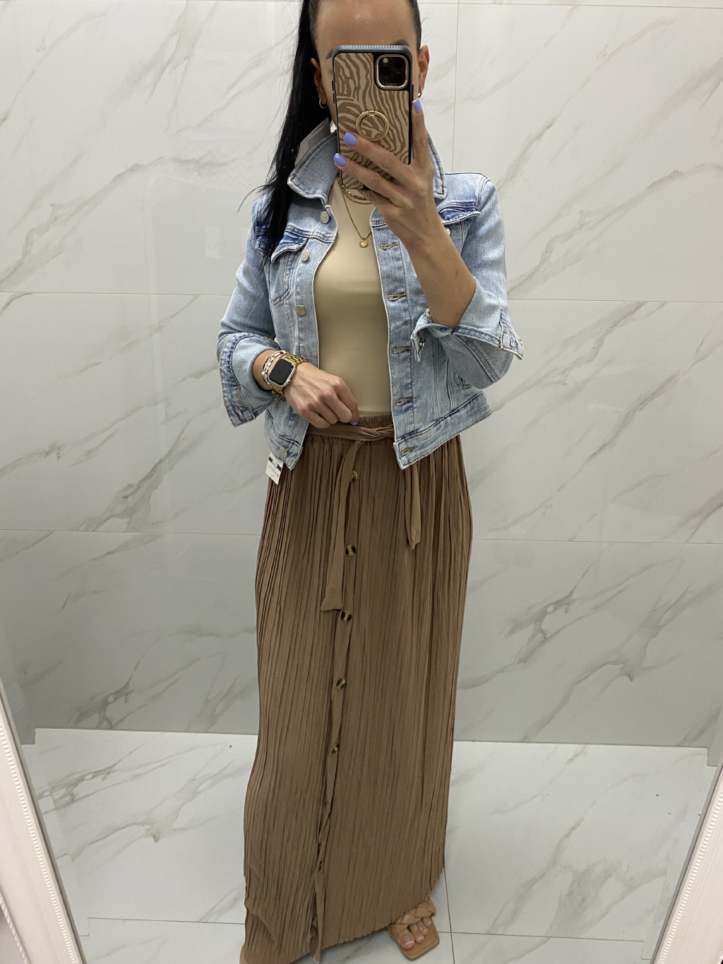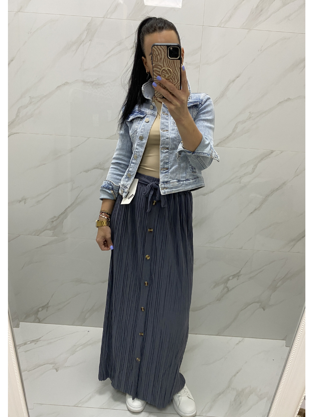 Stylové zapínání na knoflíky po celé délce a zavazování v pase dává možnost přizpůsobit si střih podle sebe. Skvěle se kombinuje s crop topem, basic trikem i džínovou bundičkou.