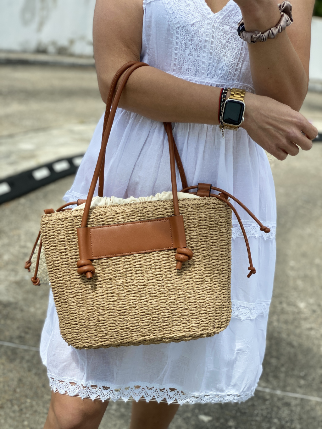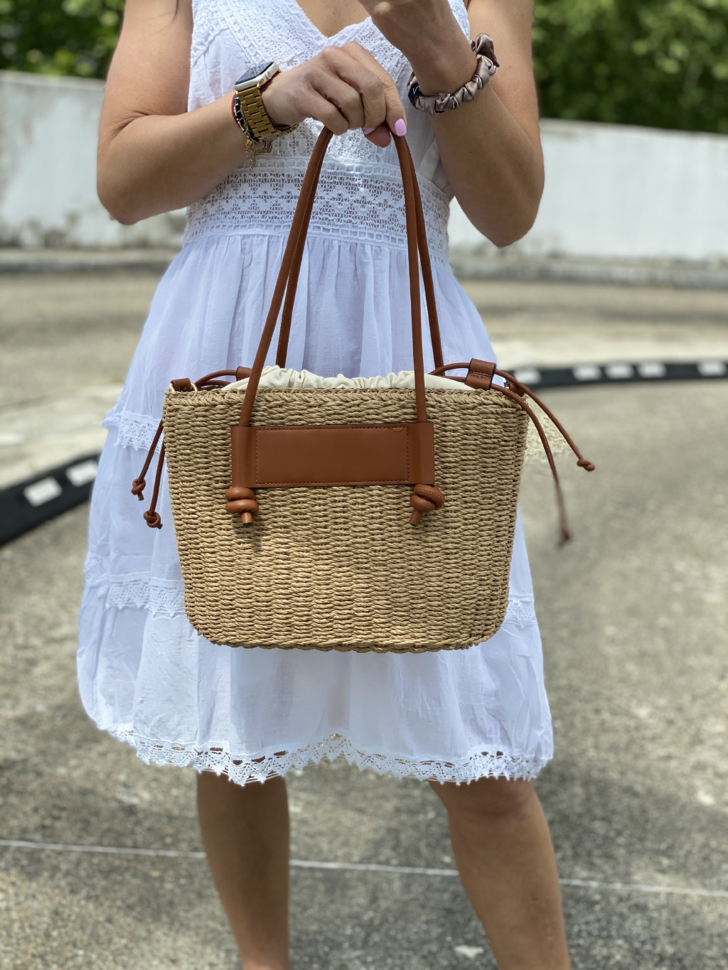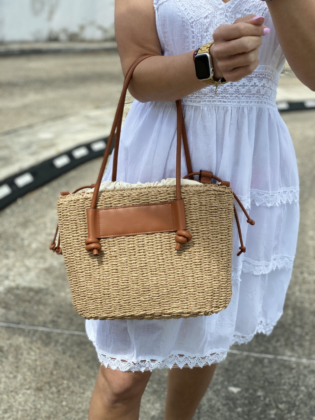 Minimalismus s nádechem elegance. Tato letní kabelka z pevného přírodního materiálu je ozdobená stylovými koženkovými detaily a uchy v karamelovém odstínu. Praktické stahování se šňůrkou dodává tašce šmrnc i funkčnost – nic ti z ní nevypadne. Ideální k letním outfitům, do města i na dovolenou.