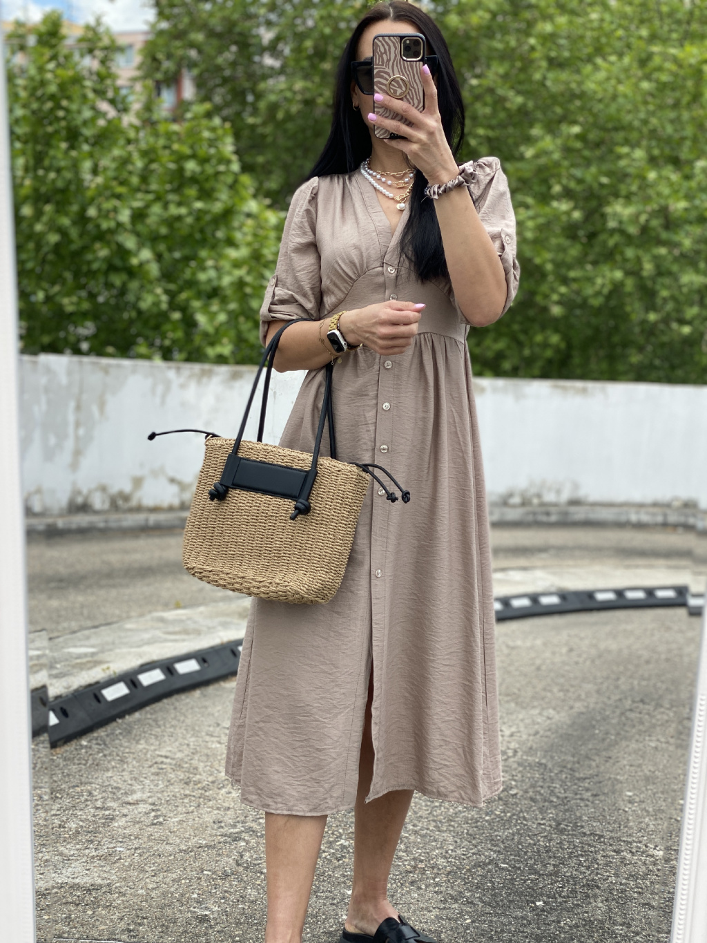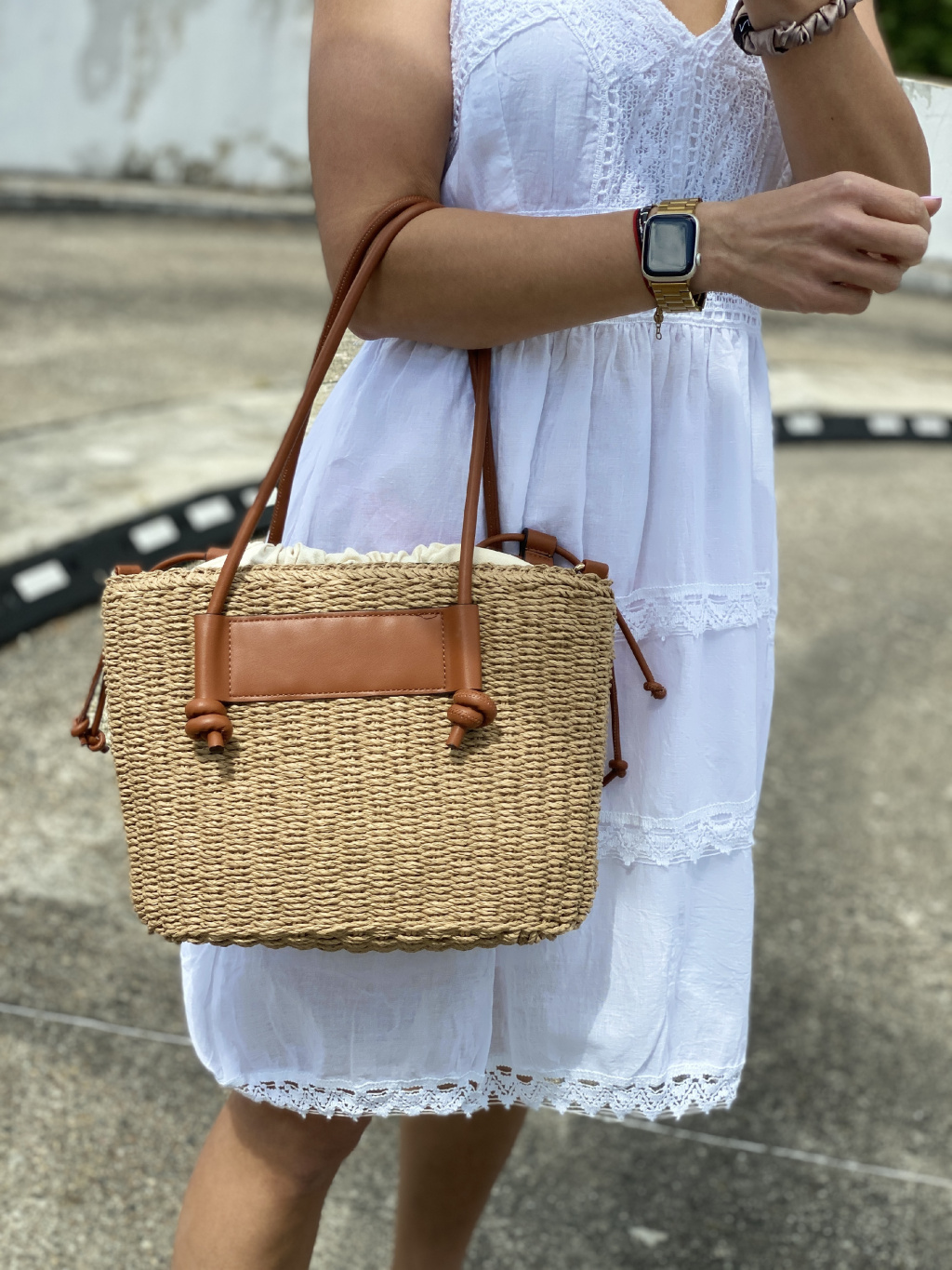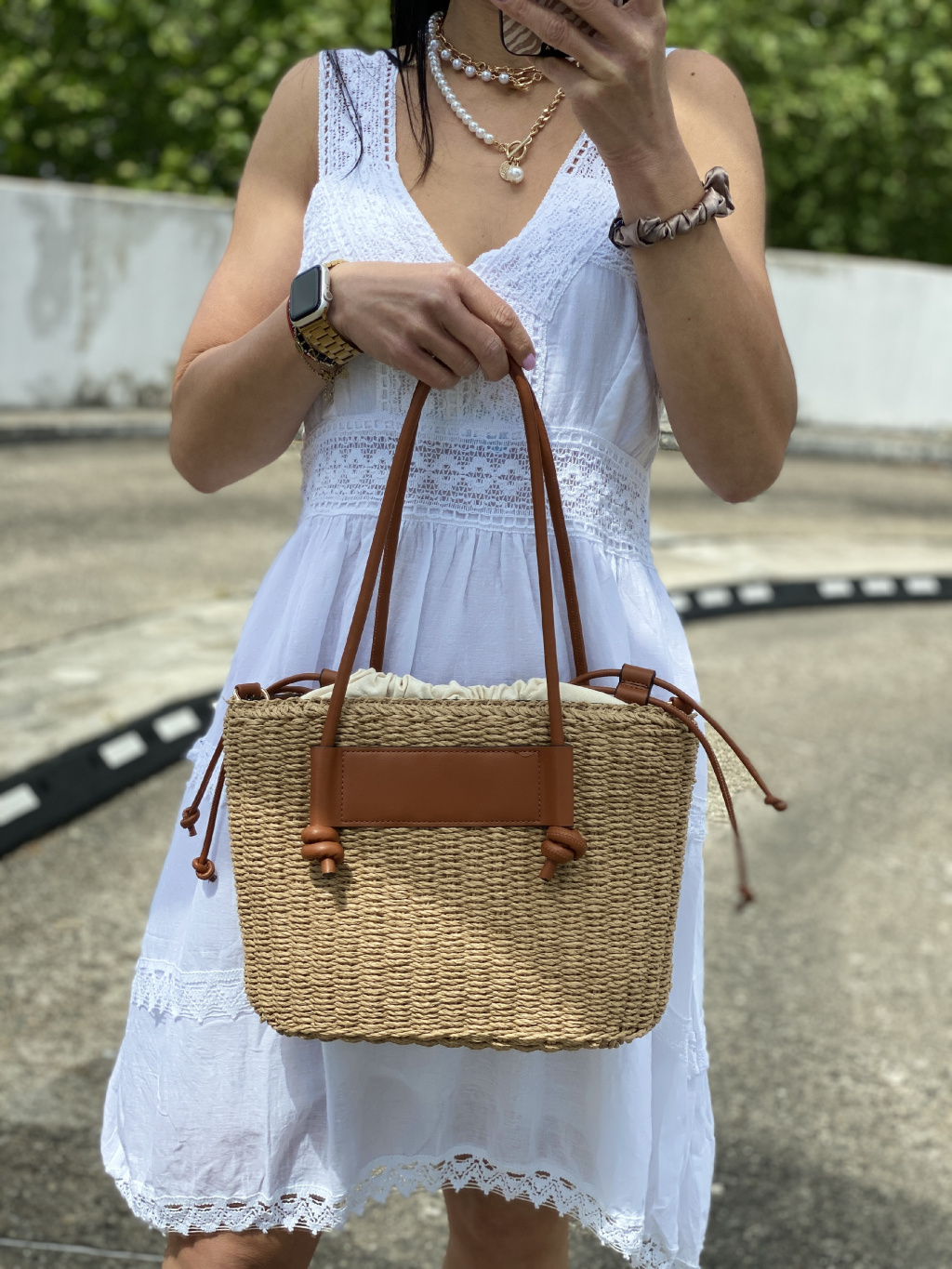 Minimalismus s nádechem elegance. Tato letní kabelka z pevného přírodního materiálu je ozdobená stylovými koženkovými detaily a uchy v karamelovém odstínu. Praktické stahování se šňůrkou dodává tašce šmrnc i funkčnost – nic ti z ní nevypadne. Ideální k letním outfitům, do města i na dovolenou.